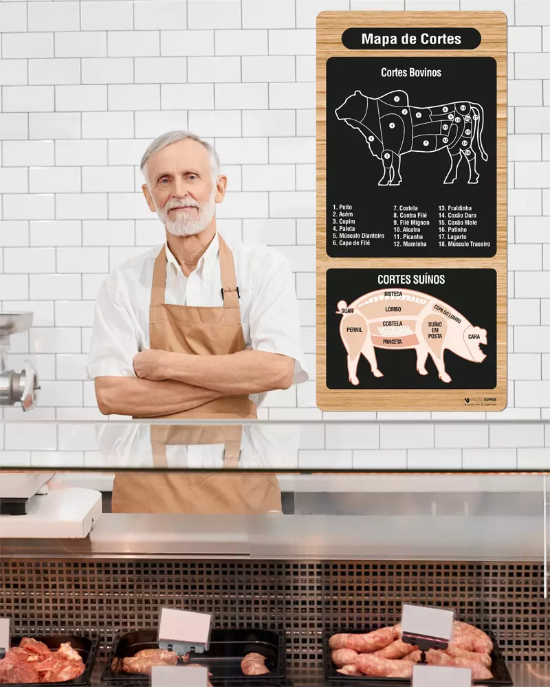 O painel é indicado para açougues, supermercados, frigoríficos, restaurantes e churrascarias, ajudando a orientar e informar clientes sobre os principais cortes de carnes.