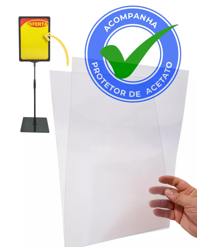 Como uma base em PS (Poliestireno), ele tem as medidas perfeitas para exibir seu material de propaganda. O tubo telescópico tem uma medida inicial de 30cm e regulagem que permite chegar até 60cm, deixando o pedestal na altura total de no máximo 95cm; sua moldura de plástico injetado e protetor em poliéster, trazem proteção e praticidade na troca do cartaz. Sua base é fixada por um parafuso de aço inoxidável que não enferruja.