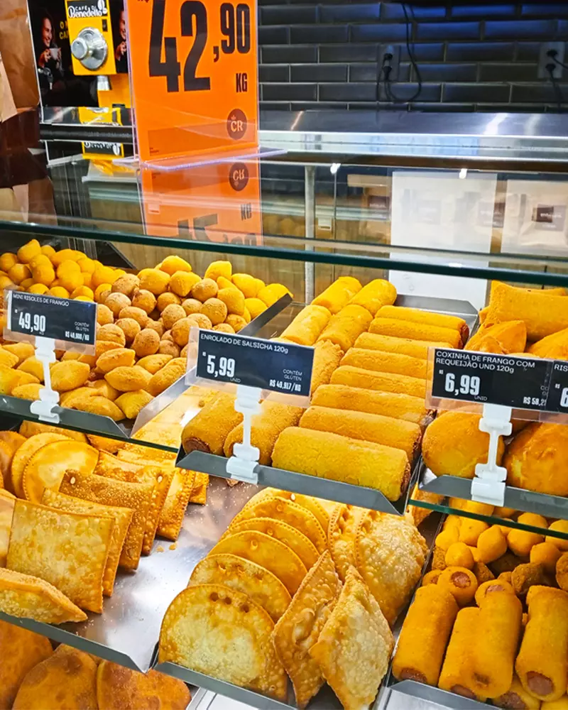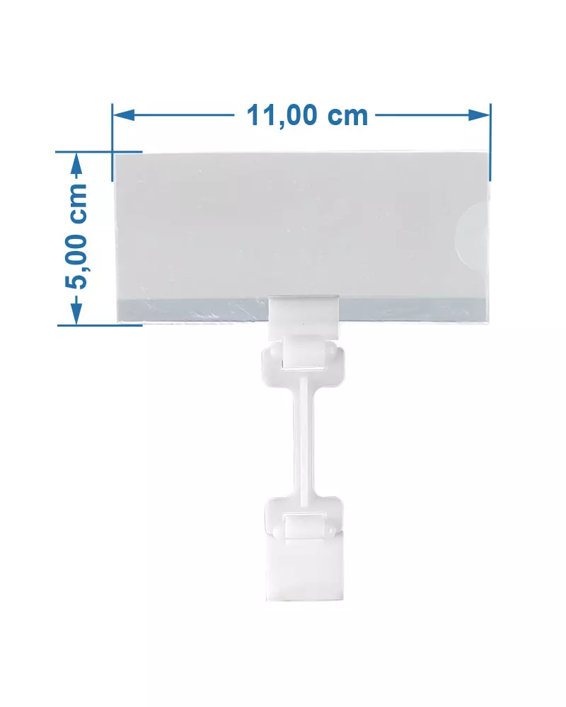 A fixação é feita por meio do prendedor plástico branco, que se adapta facilmente a gôndolas, prateleiras e displays, garantindo firmeza e estabilidade.
